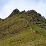 Le sentier est très joli, au fil de la montée il change complétement avec un passage d’abord très boisé où nous marchons sur des épines de pins puis nous passons dans les fougères et à 500m du sommet les arbres se font de plus en plus petits. Il y a pas mal de vent avec des nuages qui passent mais nous apercevons la vue tout de même. 4h50 après notre départ de l’hôtel nous voilà au sommet à 4096m! Nous n’avons croisé absolument personne! Il fait beau et nous prenons le temps de faire quelques photos puis direction l’arrivée du téléphérique.