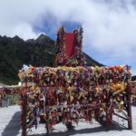 Nous trouvons des fanions du LEI ULTRA TRAIL ENDURANCE RACE LEAGUE qui a eu lieu le 25 mai et suivons un petit moment ce chemin, puis ça monte. Nous passons au milieu de tombes et après 500m de dénivelé rejoignons le chemin complètement dallé et plutôt plat qui va d’une arrivée de téléphérique à l’autre d’environ 11km. De ce chemin nous cherchons les sentiers qui continuent de monter en direction des sommets mais tous sont interdits. Les panneaux indiquent que étant donnés les disparus et morts, les sentiers sont fermés pour notre sécurité. On retrouve bien là ce qu’on avait déjà un peu ressenti notamment au moment de faire le visa : on a le droit de visiter mais il faut rester dans les sentiers battus et surtout ne pas sortir du moule!