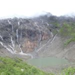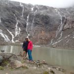 Nous débutons avec un tout petit rayon de soleil mais ça ne va pas durer longtemps. Rapidement les parapluies vont être de sortie! Dans la dernière montée nous doublons une dizaine de chinois qui montent difficilement. Il faut dire qu’ils n’ont pas le matériel le plus adéquat mais ils sont volontaires! Arrivés au Lac nous avons la chance que la montagne se découvre un peu pour voir les glaciers au dessus. C’est imposant! La descente se fera sous la pluie. Avec de nouveau une pause dans les abris et la visite d’un écureuil! Lui va carrément escalader Pierre pour aller chercher à manger!